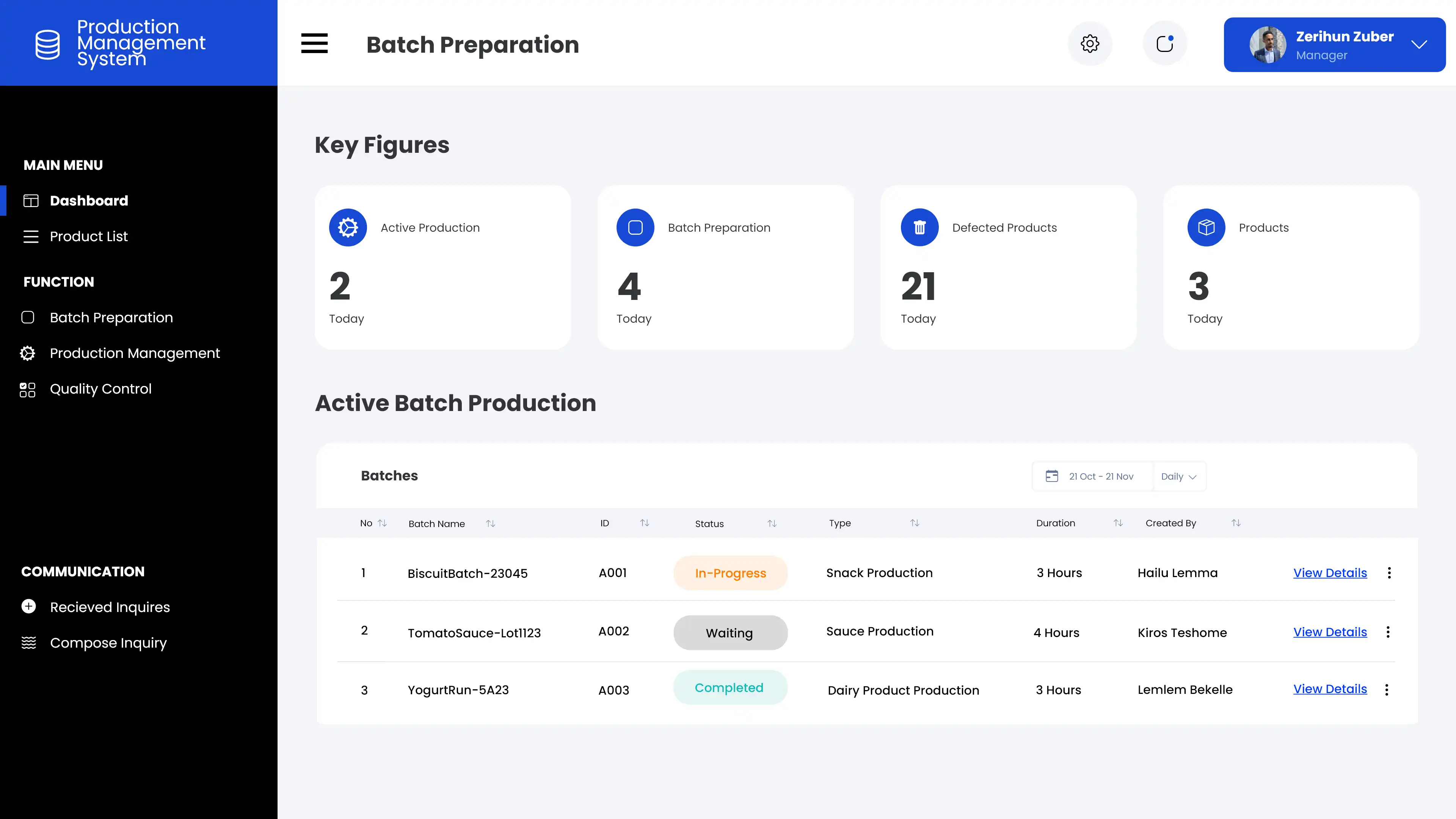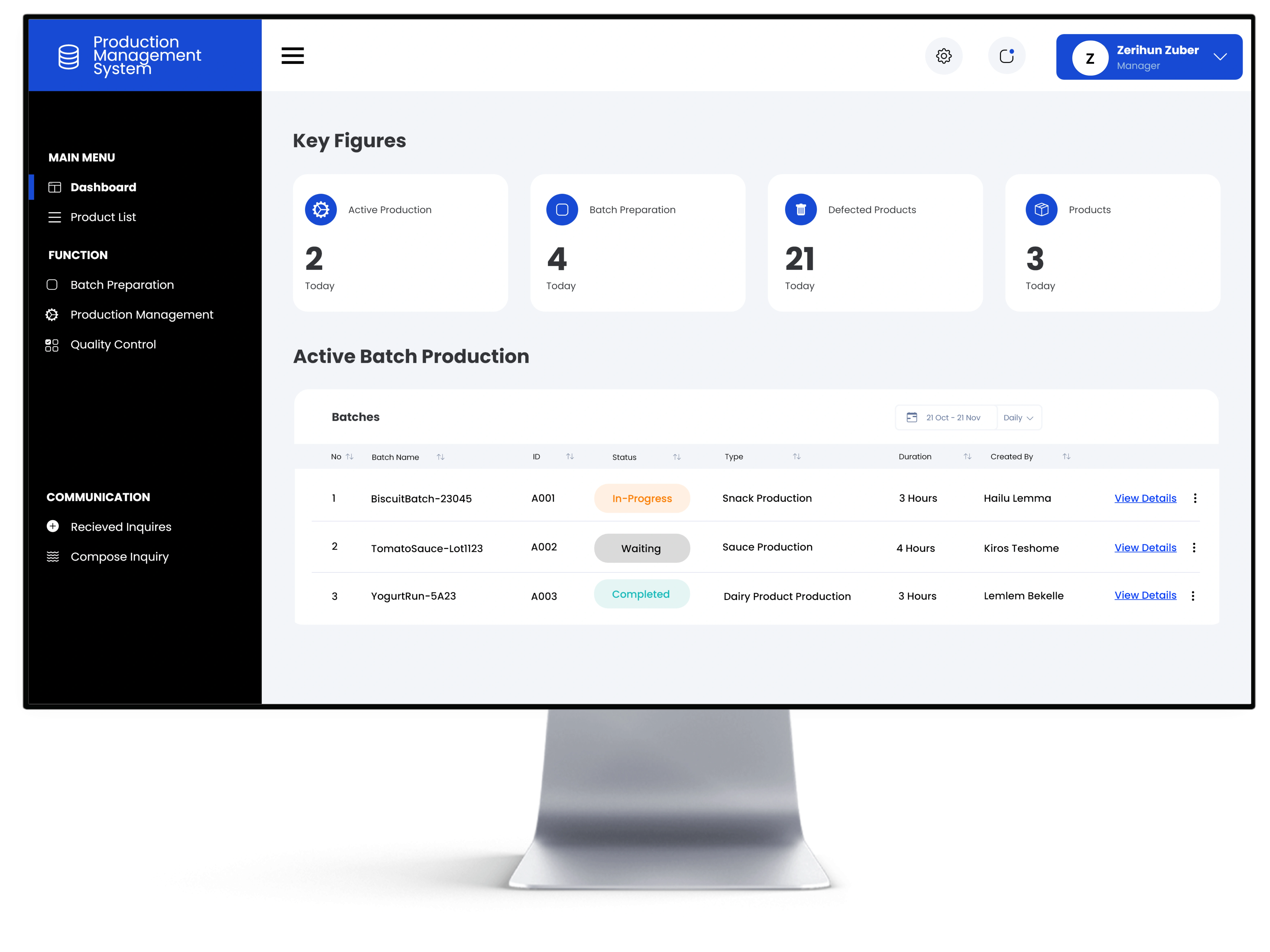 This system will assist in managing the production of consumer goods, electronics, and automotive parts by ensuring seamless workflow coordination. It will optimize inventory by tracking raw materials and minimizing waste. The system will track production schedules to prevent bottlenecks and improve efficiency. Additionally, it ensures real-time monitoring for quality control, reducing defects and maintaining compliance with industry standards.